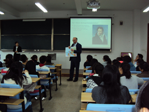 11月3日下午14点整,全院三届德语班学生端坐在教室里,等待着德国教育学者Poehl先生。接下来的一个多小时里面,我们接受的不仅仅是来自一位教育学者的教学心得,更是一种文化的传播。在简单的介绍过后,讲座以一位德国哲学家的生平事迹开始展开。他告诉大家,在有限的时间里学习无限的知识,无论什么行业什么梦想,最后都能活出自己的精彩。这一切的基础都是学习。