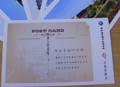 (二)学长寄语,贴心服务。在今年的新生入学大礼包中,我系除了送给学生和家长一份传统的礼物,即家校联系卡外,还特别为新生制作了一份学长寄语明信片,体现来自学长的片片心意。小小明信片,一面是经贸的风景,一面是学长的寄语,“萤火虫的可贵,在于用那盏挂在后尾的灯,专照别人;你的可贵,则在于总是给别人提供方便”,既是学长的嘱托,也是辅导员和班主任老师的叮嘱。