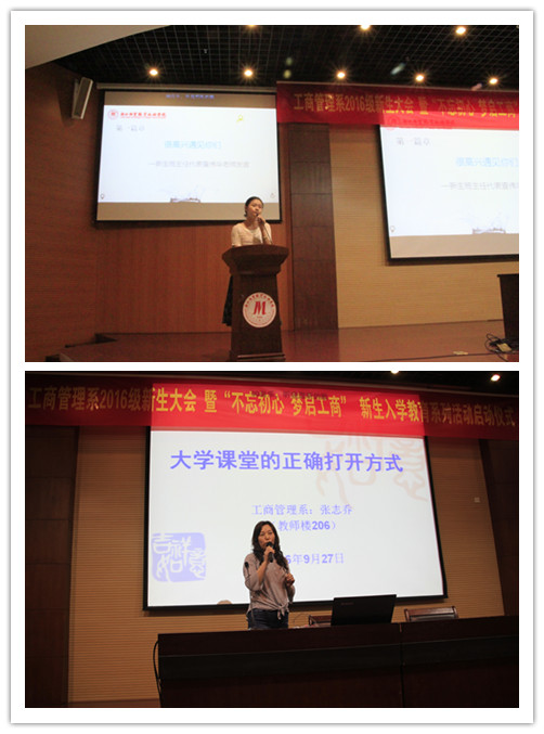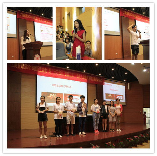 活动分“师生寄语”、“工商骄傲”、“共筑梦想”、“成长引领”等四个篇章有序展开。系副主任张西华老师首先发表了题为“努力当下,梦创未来”的迎新致辞,向新生们介绍了我系基本系情和发展概况,并对全体新生提出了“懂得学习,懂得创新,学会思考,学会感恩”的殷切希望。新生班主任代表查伟华老师则以一位老班主任的角度,向新生们传递了四个具体的建议:做事德为重,做人德为先;端正心态,从“零”开始;学会规划,重在行动,甘于奉献,要有担当。